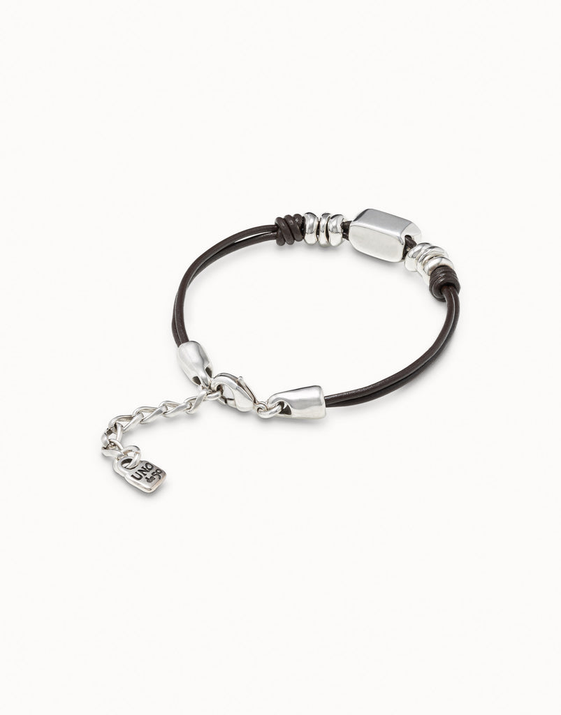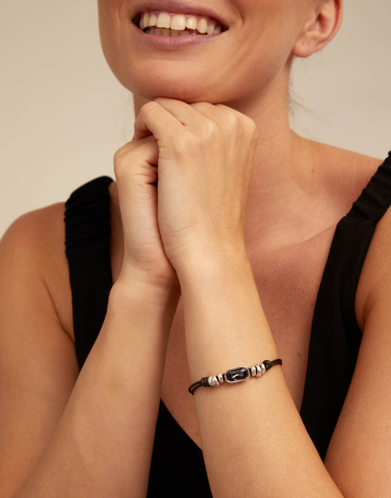 Pulsera de 2 tiras de cuero y abalorio central de plata con cristal gris y cierre mosquetón. Pulsera formada por dos tiras de cuero y un abalorio central con un cristal gris.