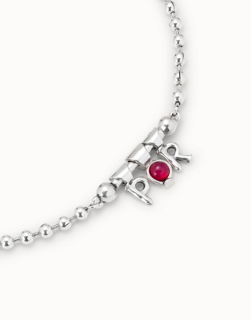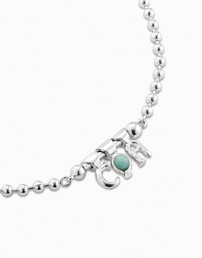 Este original complemento consta de un clásico cierre de mosquetón y de múltiples bolitas de entre las que destaca, en el centro de la joya, un llamativo charm en forma cilíndrica donde podrás colocar diferentes charms.
